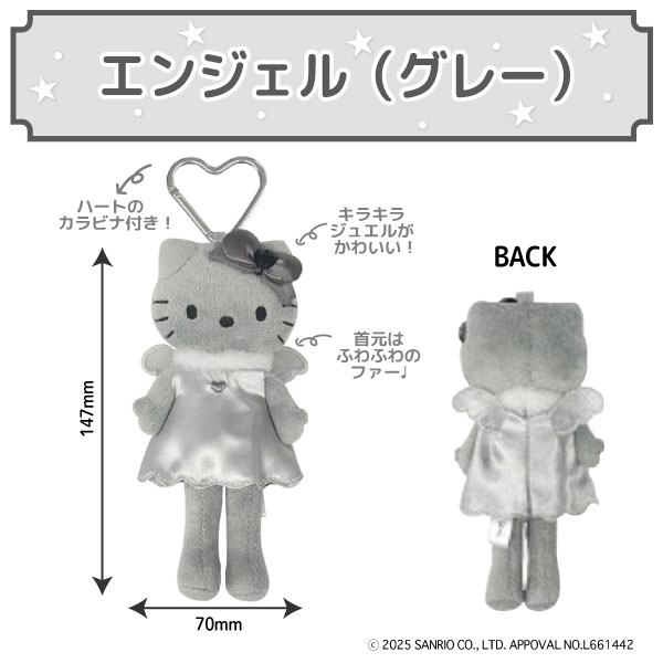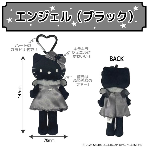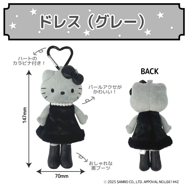 |キティ|ハローキティ|モノクロ|モノトーン|白黒|ぬいぐるみ|マスコット|おしゃれ|脚長|スタイルアップ|かわいい|ドレス|ギャル|スクバ|エンジェル|羽|グレー|黒|ハート|カラビナ|キャラクターグッズ|