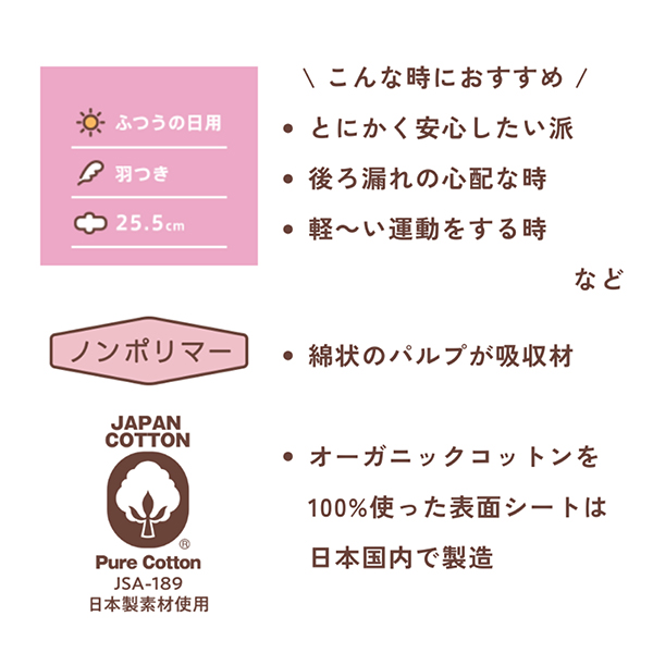 女性用フェムケア商品、吸水性ポリマー不使用(ノンポリマー)の羽つきタイプ。