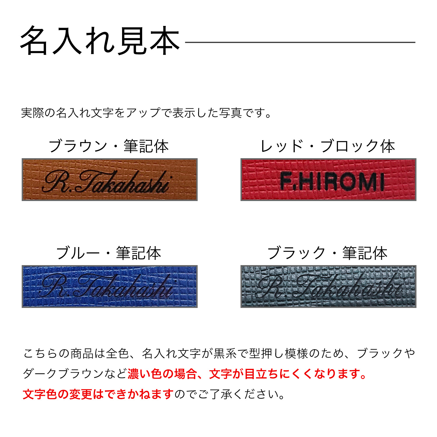 [名入れ注意事項] ※名入れの文字色が黒系のため、ブラックなど濃いお色の場合、文字が目立ちにくくなります。 文字色の変更はできかねますので、ご了承の上ご注文ください。 名入れ文字を目立たせたい場合はブラウンなどをおすすめ致します。 ※型押しレザーのため、筆記体など、細めの書体の場合は名入れ文字が見えにくい場合がございます。 ※お名入れ文字を強くこすると文字がにじんだり、色移りする場合がございます。ご注意ください。 ※名入れ位置は見本と多少異なる場合がございます。 ※こちらの商品名入れ可能な範囲が狭いため、可能な文字数は下記となります。 筆記体、ブロック体:7文字程度 日本語:5文字程度