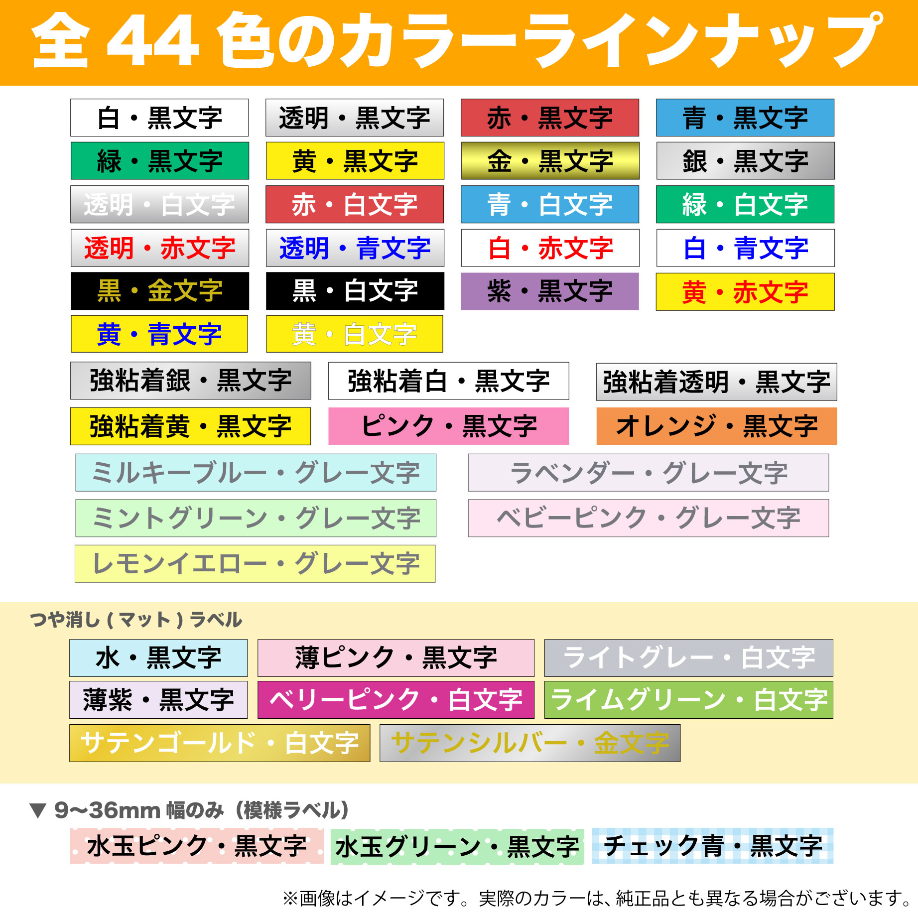 テープ幅12mm/テープ長8m(純正同等) ※マットラベルはテープ長が異なります。水・黒字、薄ピンク・黒字、薄紫・黒字は4m、ベリーピンク・白字、サテンシルバー・金字、ライトグレー・白字、ライムグリーン・白字、サテンゴールド・白字は5m