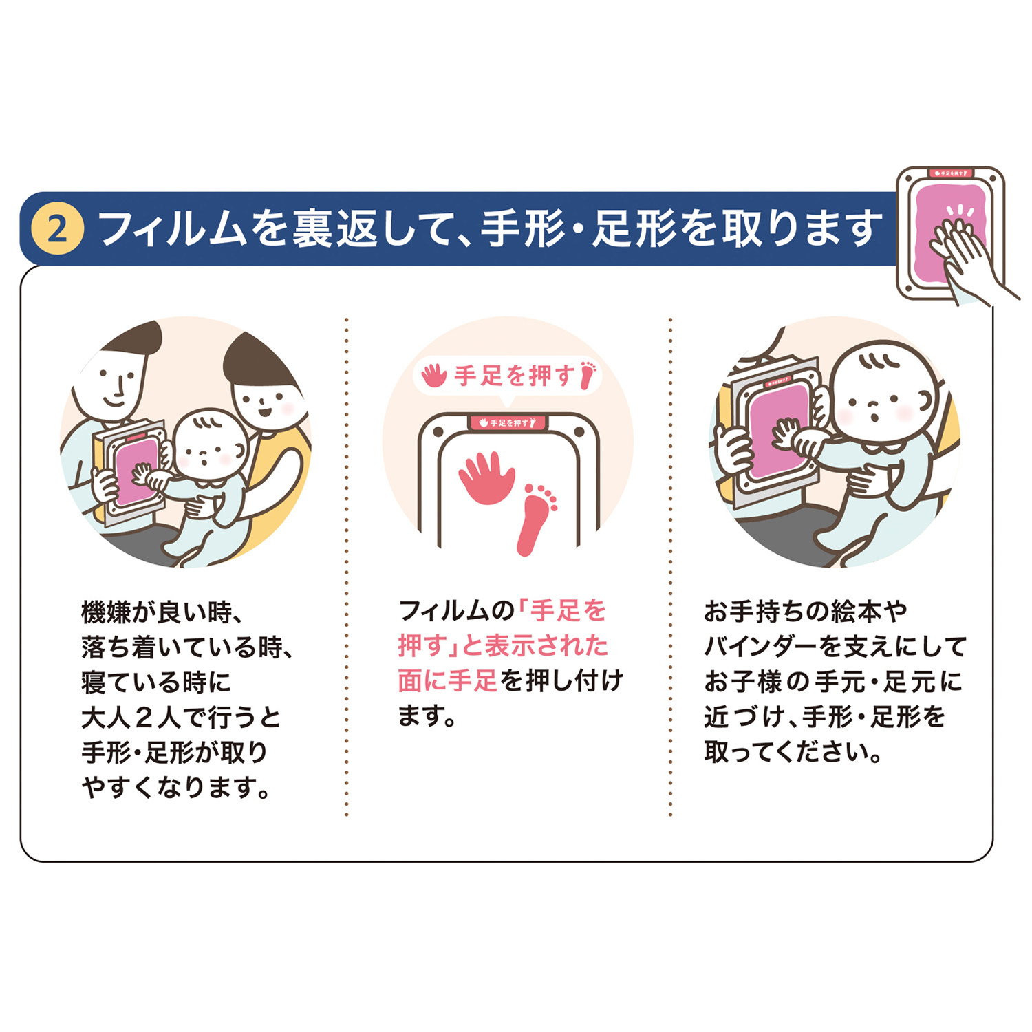 <手形・足形の取り方> 1.フィルムにインキを塗ります。 フィルムの「インキを塗る」と表示された面にインキを塗ります。 2.フィルムを裏返して、手形・足形を取ります。 大人2人で行うと手形・足形が取りやすくなります。 ※手形・足形を上手に取るためのコツがパッケージにQRコードで紹介されていますのでご確認下さい。 3.完成〜保管 使い終わったら、おしりふきや濡れたティッシュでインキを拭き取ってから保管して下さい。