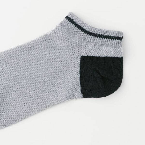 【すぐれた吸水速乾性】 ・シャリ感のあるポリエステル素材を使用したスニーカー丈ソックス。 ・つま先かかと以外の編地がメッシュ編みになっているので、よりムレにくく涼し気な足元に! ・デイリーにもスポーツシーンにも使えます。